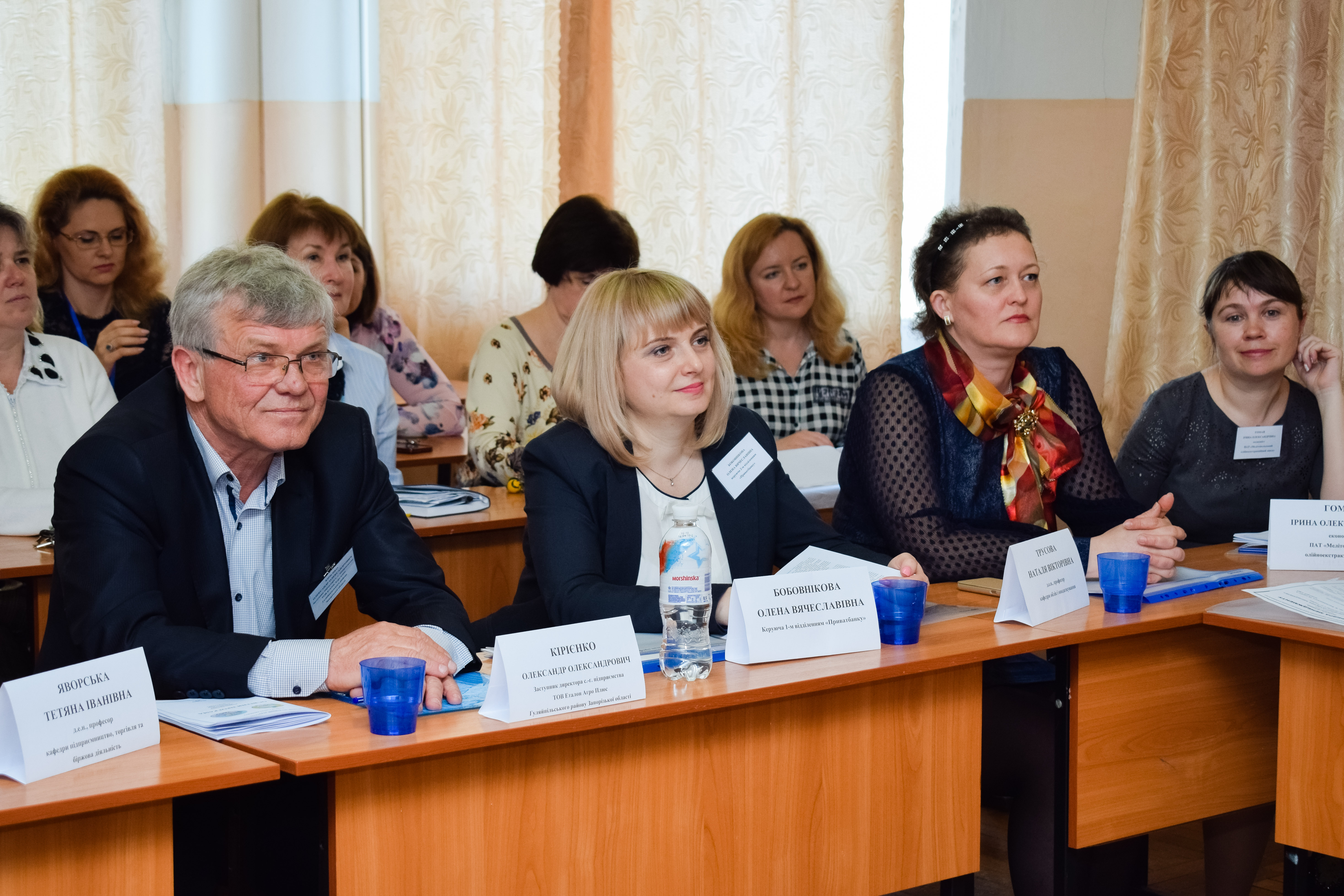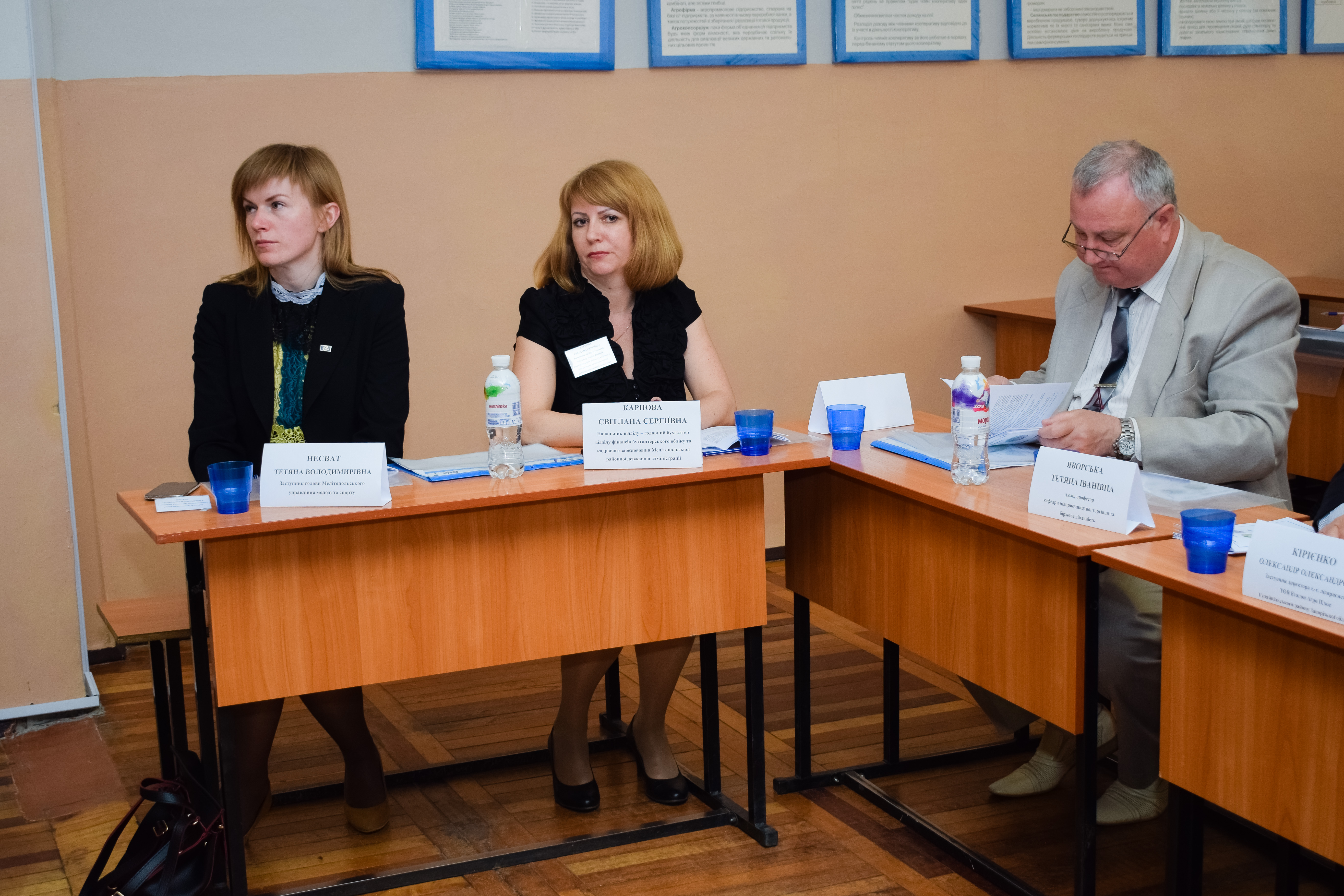 ПРИСУТНІ: проректор з НПР к.т.н., доцент Ломейко О.П., декан факультету економіки та бізнесу, к.е.н, доцент Карман С.В., завідувач кафедри менеджменту, д.е.н., професор Нестеренко С.А., завідувач кафедри підприємництво, торгівля та біржова діяльність, д.е.н., професор Яворська Т.І., завідувач кафедри обліку та оподаткування, д.е.н., доцент Трусова Н.В., завідувач кафедри цивільної безпеки, к.т.н., професор Рогач Ю.П., к.е.н., доцент кафедри менеджменту, Агєєва І.В., к.е.н., доцент кафедри менеджменту, Бочарова Н.О., к.е.н., доцент кафедри менеджменту, Кравець О.В., к.т.н., доцент кафедри менеджменту, Назарова О.П., к.е.н., доцент кафедри менеджменту, Плотніченко С.Р., к.е.н., доцент кафедри менеджменту, Розуменко С.М., к.е.н., доцент кафедри менеджменту, Сурженко Н.В., к.е.н., доцент кафедри менеджменту, Шевчук О.Ю., к.е.н., ст..викл. кафедри менеджменту, Редько Л.І.; к.е.н., доцент кафедри підприємництво, торгівля та біржова діяльність Болтянська Л.О., к.е.н., доцент кафедри підприємництво, торгівля та біржова діяльність Власюк Ю.О., к.е.н., доцент кафедри економіки Почерніна Н.І., ст.. викл. кафедри економіки Васильченко О.О., к.е.н., доцент кафедри обліку і оподаткування Кучеркова С.А., к.е.н., доцент кафедри обліку і оподаткування Костякова А.А., ст.. викл. кафедри суспільно-гуманітарних наук Зімонова О.В., ст.. викл. кафедри іноземних мов Мунтян С.Г., начальник ВТК ТОВ ВКФ «Надія Гранденс» Островська І.О., заступник директора с.-г. підприємства ТОВ «Еталон Агро Плюс», головний бухгалтер управління агропромислового розвитку Мелітопольської районної державної адміністрації Карпова С.С., керуюча 1-м відділенням «Приватбанку» Бобовнікова О.В., директор зі збуту ТОВ «ІЗ Клінценбау» Бабернова М.В., в.о. директора ТОВ «Мелітопольські теплові мережі» Станков Є.Ю., директор ресторану «Рассвет» (ПП «Стоячко») Стоячко С.М., заступник голови правління, радник спостережної ради з економічних питань ПАТ «Мелітопольський м’ясокомбінат», заступник голови мелітопольського управління молоді та спорту Несват Т.В., офіс-менеджер туристичної агенції «Браво-тур» Козлякова Л.Д., менеджер туристичної агенції «Браво-тур» Шевченко Д.М., начальник Царічанського масло цеха ПРАТ Комбінат «Придніпровський» Бойко Г.І., керівник відділу кадрів ВАТ «Мелітопольський хлібокомбінат» Артамошина О.В., директор ПрАТ «Мелітопольський олійноекстракційний завод» Рудченко С.О.