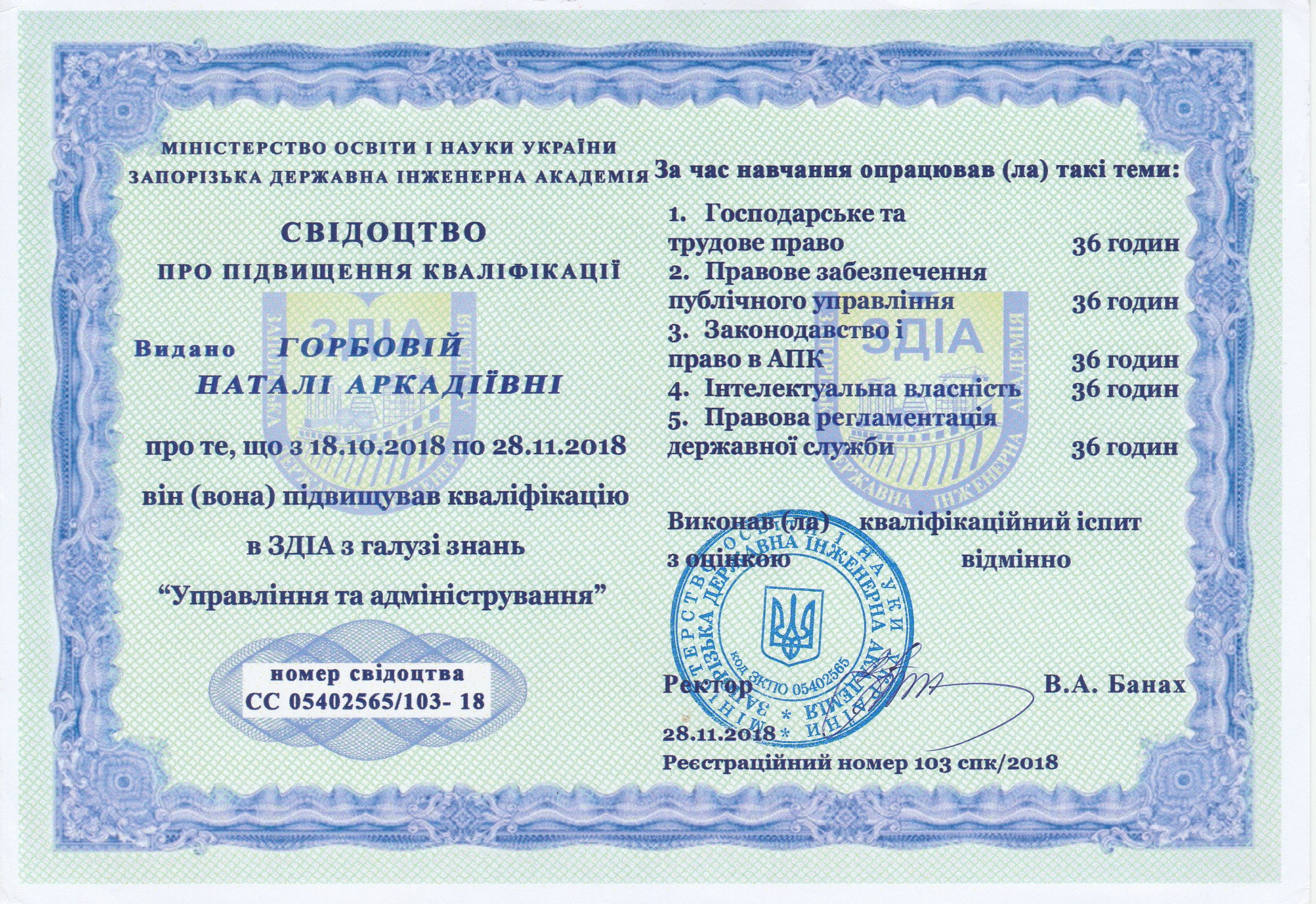 - З 18.10.2018 до 28.11.2018 підвищувала кваліфікацію у Запорізькій державній інженерній академії в галузі знань "Управління та адміністрування"