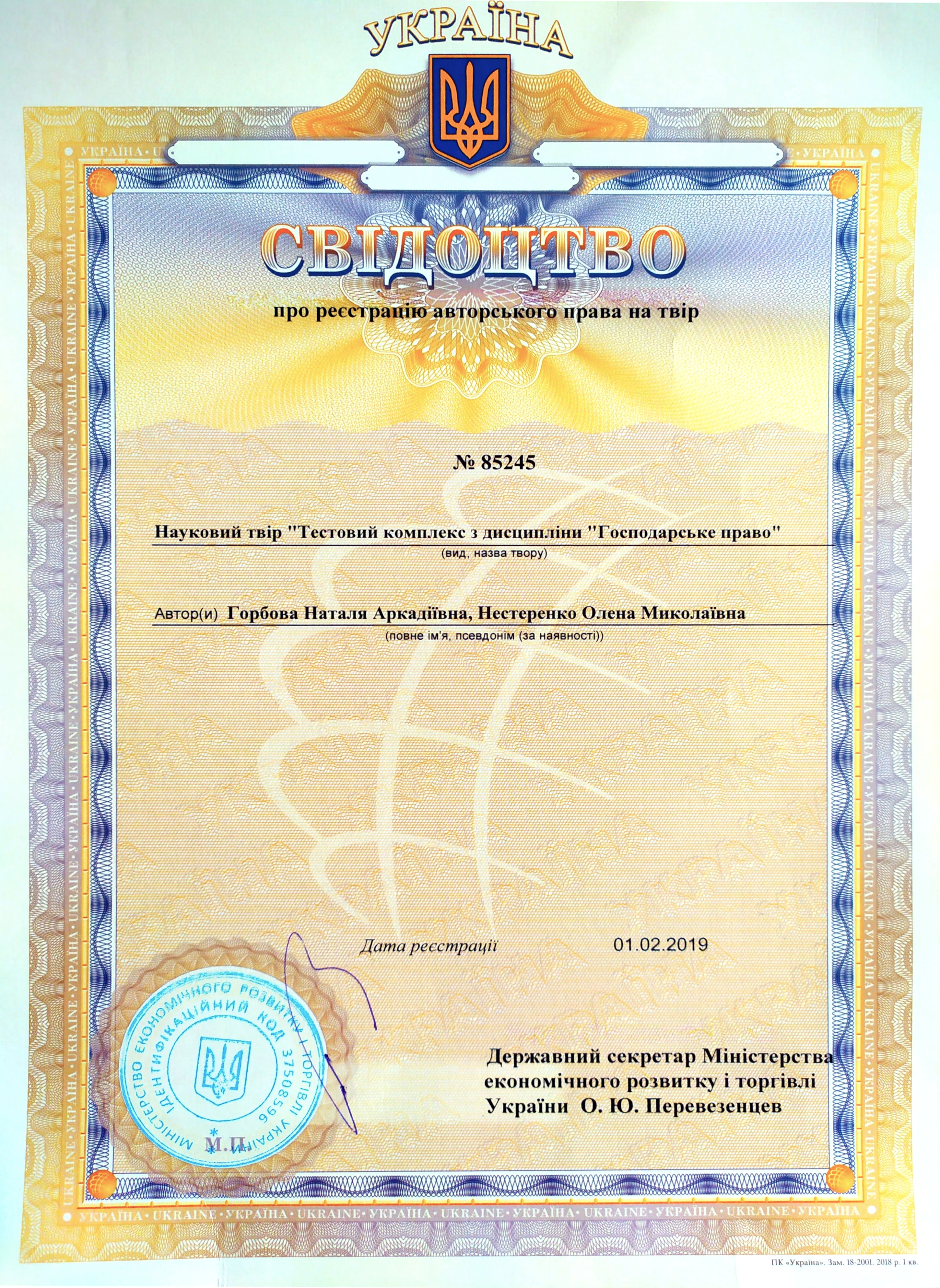 1) «Тестовий комплекс з дисипліни «Господарське право»»: Свідотство про реєстраію авторського права на твір № 85245 від 1.02.2019