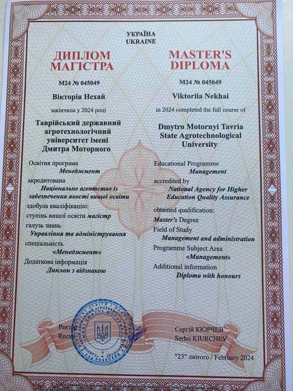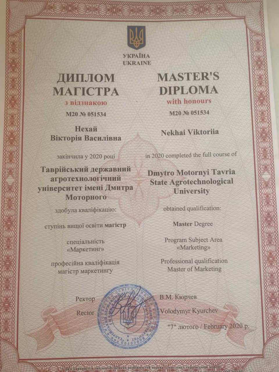 - Certificate issue to certify that Nikhai Viktoriia successfully completed Scientific and pedagogical internship "Theory and practice of scientific and pedagogical approaches in education" from March 29, 2021 until April 29, 2021