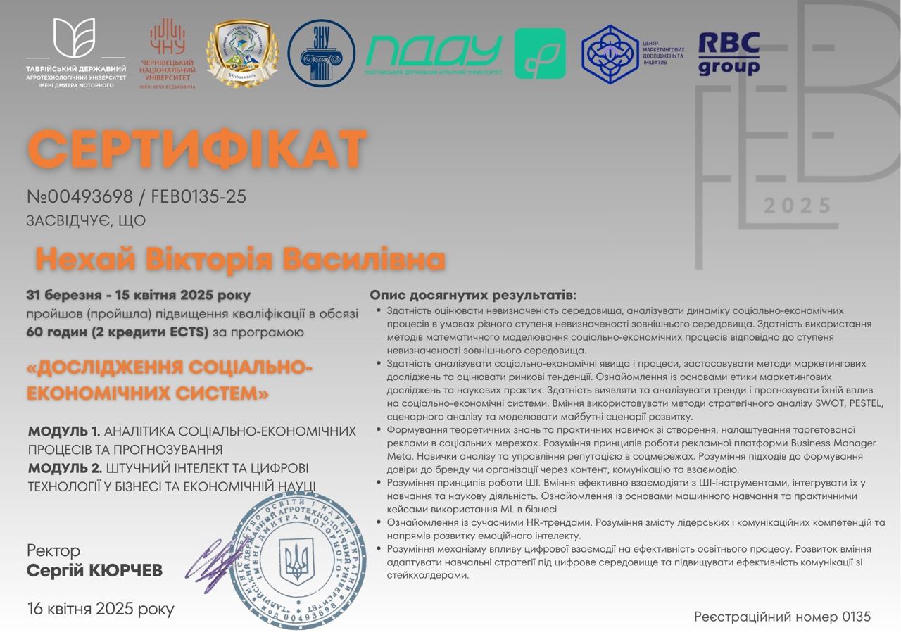 Підвищення кваліфікації за програмою"Дослідження соціально-економічних систем" № 00493698 / FEBO135-25 (2025 р.)