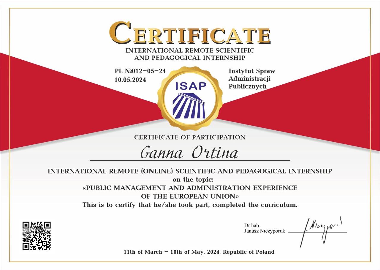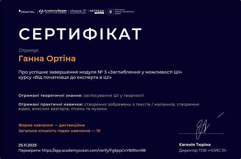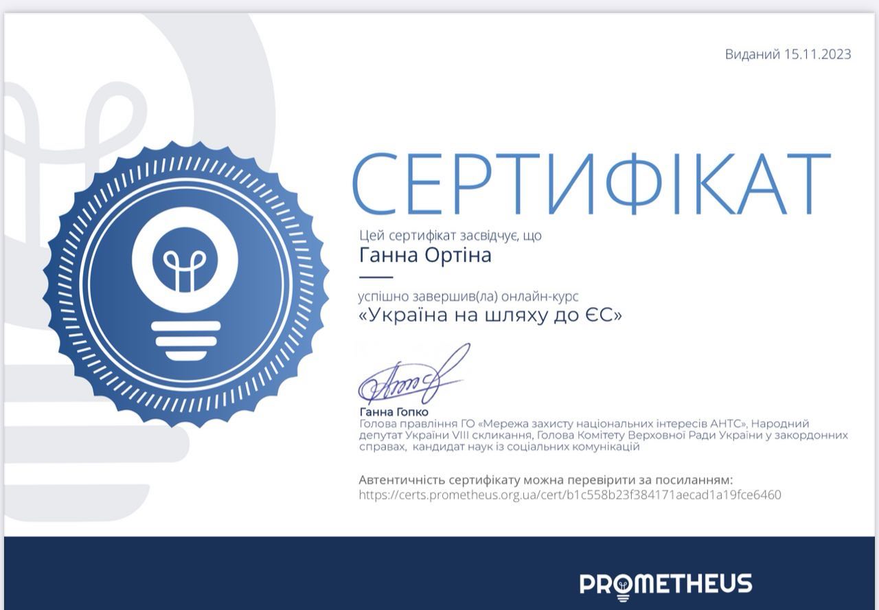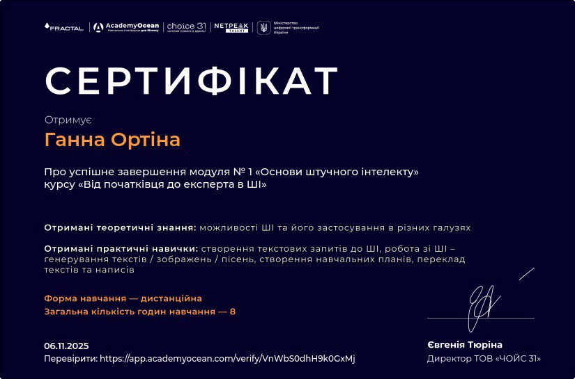 Сертифікат ISAP Додаток ISAP Сертифікат Україна на шляху до ЄС 15.11.2023 Сертифікат Сталий розвиток 15.02.2025 - Сертифікат Основи штучного інтелекту