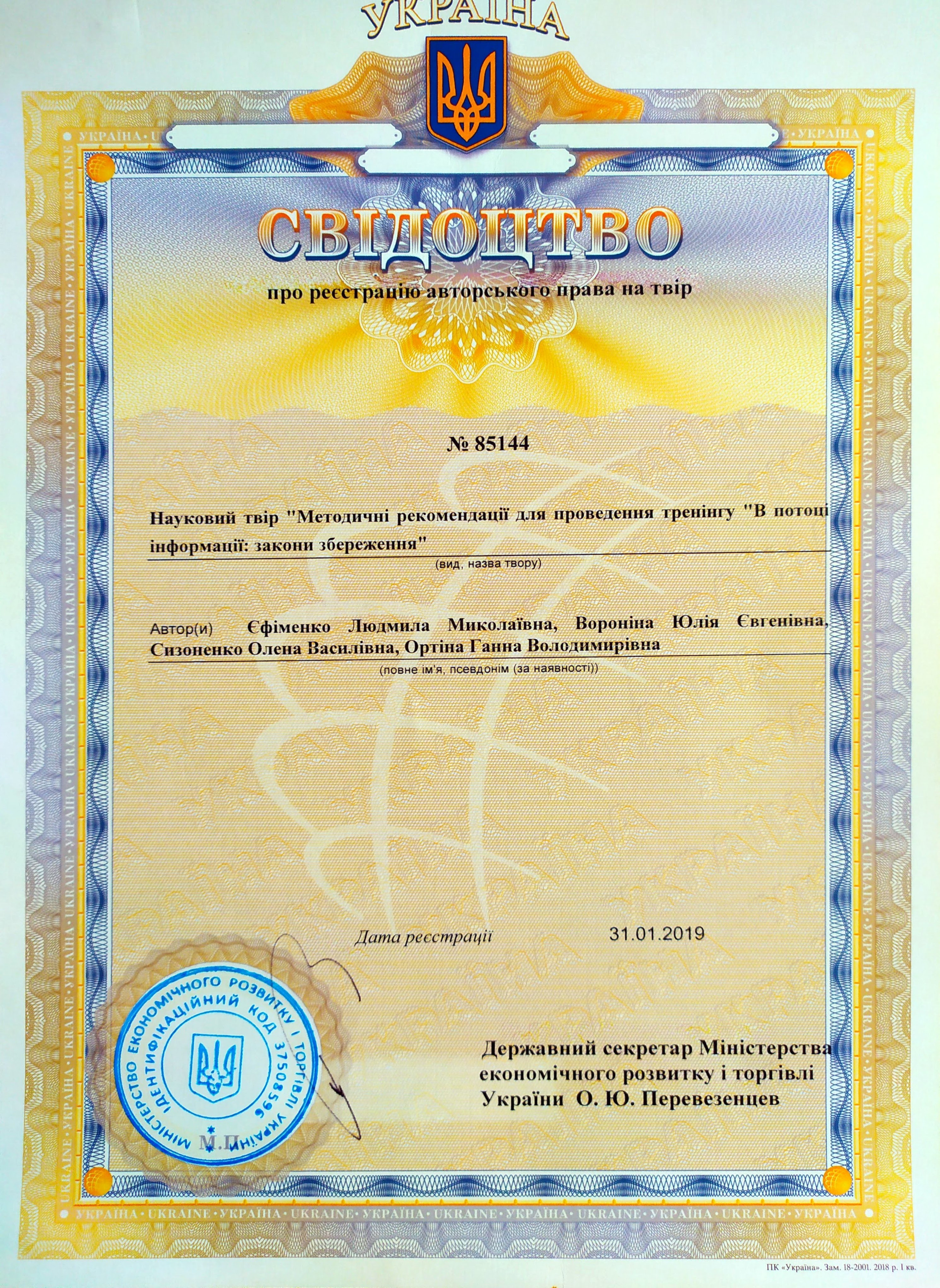 № 85144. Науковий твір “Методичні рекомендації для проведення тренінгу “В потоці інформації: закони збереження”