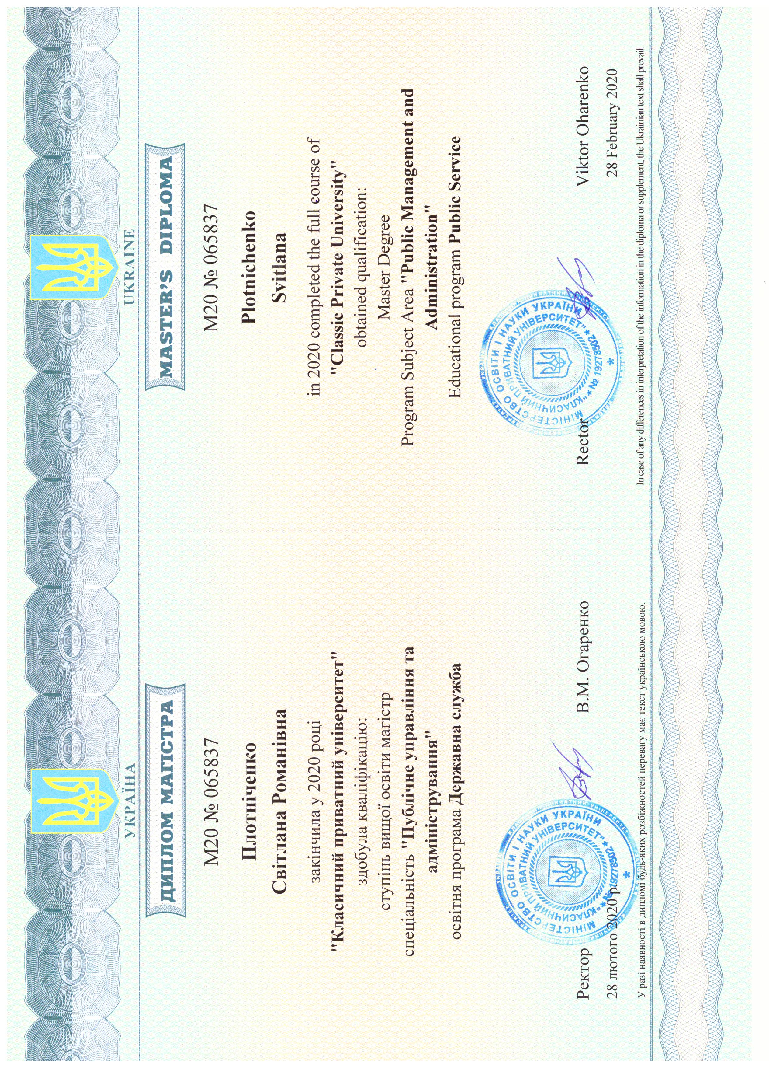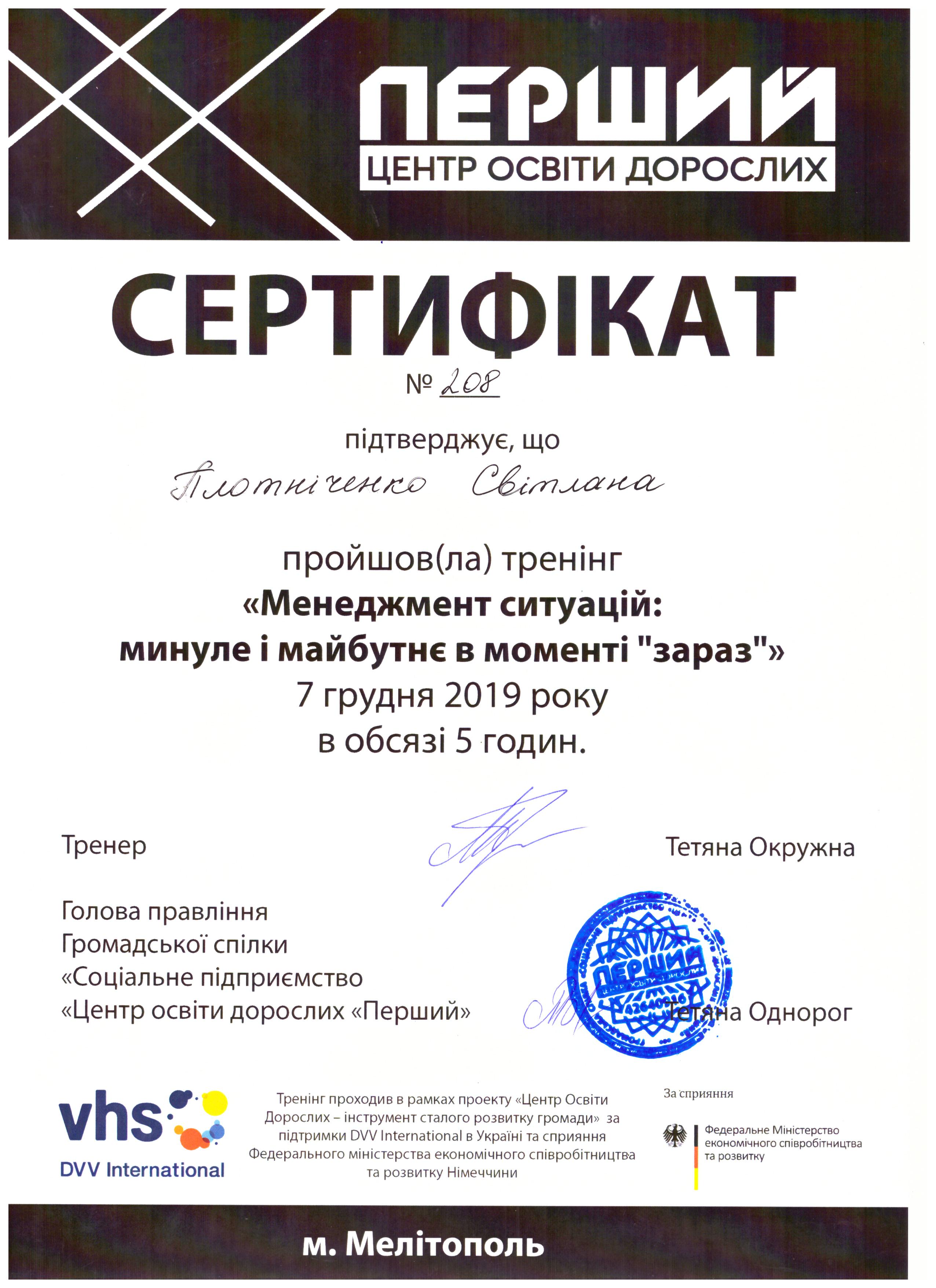 Сертифікат 7 грудня 2019 р. (успішно завершила тренінг «Менеджмент ситуації: минуле і майбутнє в моменті "зараз"»).