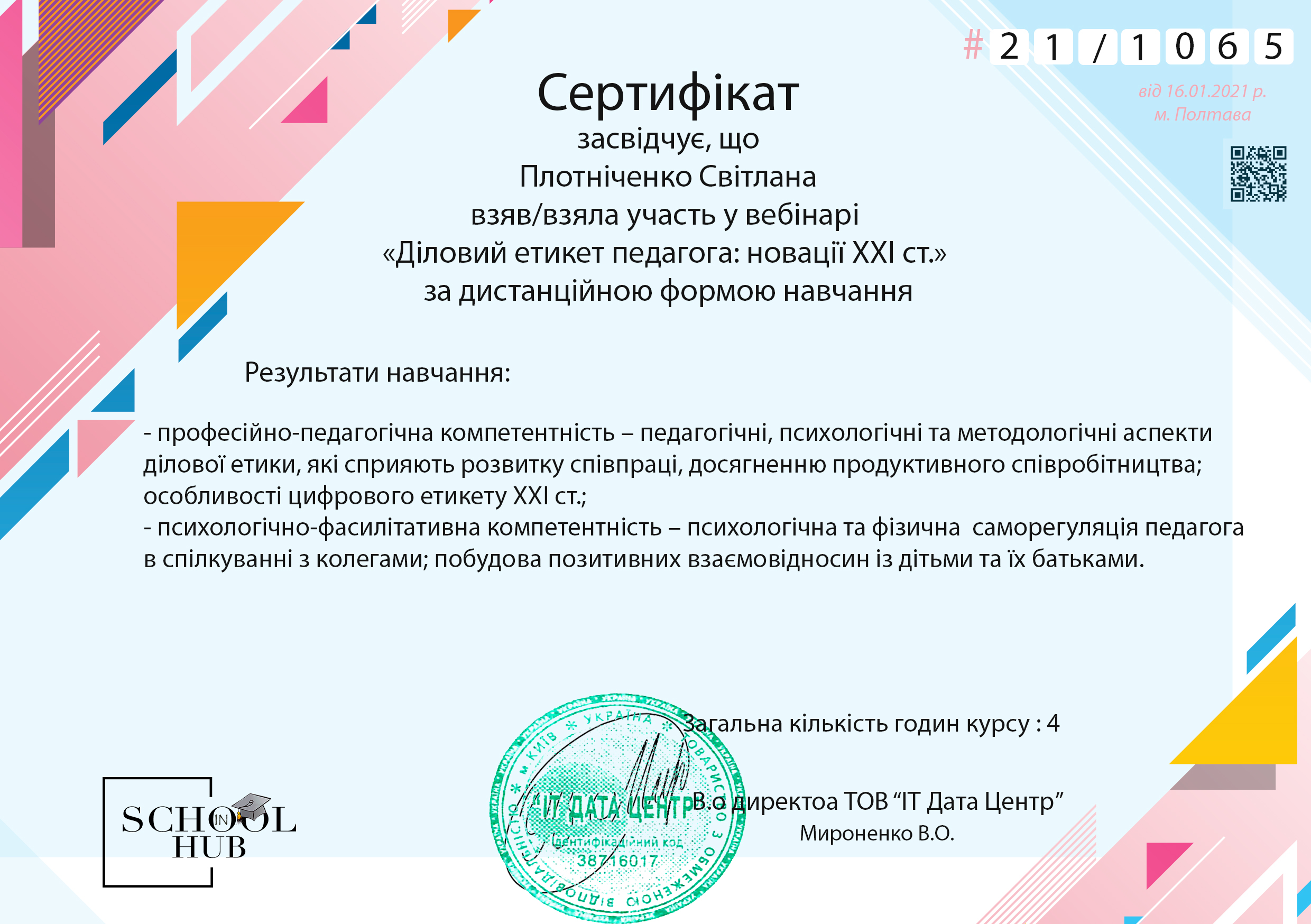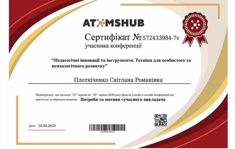 Сертифікат № 68776667 29-30 травня 2020 р. (учасник Міжнародної науково-практичної конференції: «Актуальні проблеми неперевної освіти в інформаційному суспільстві»).