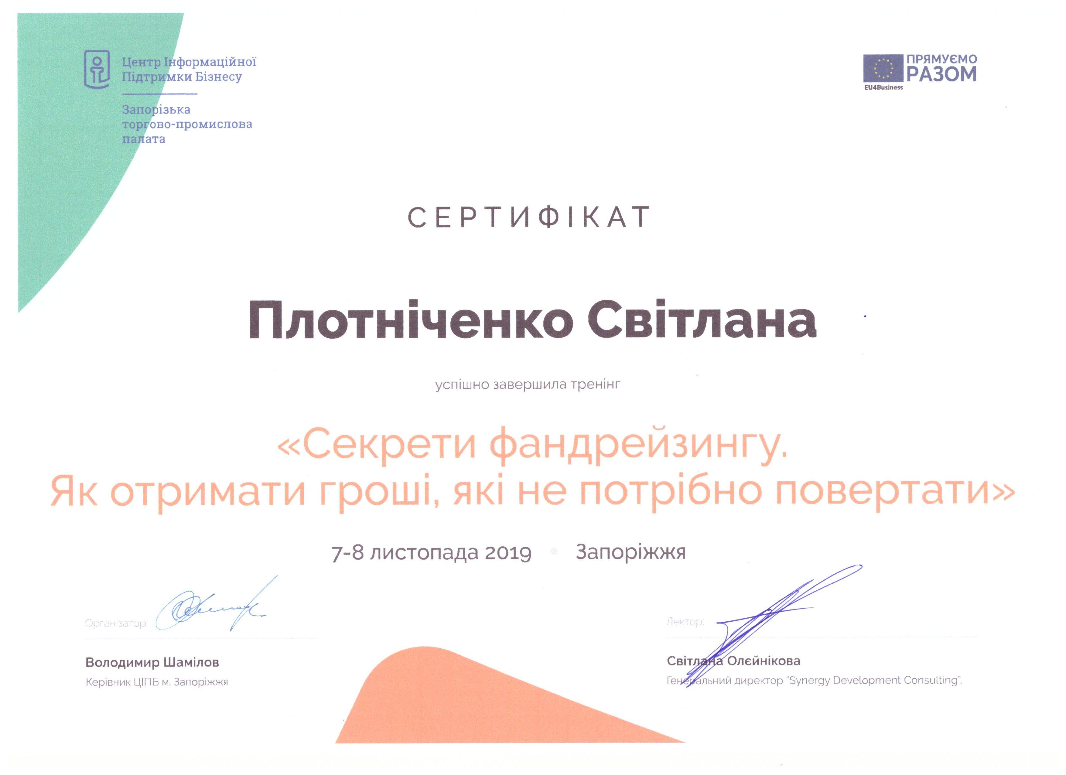 Сертифікат 7-9 лиcтопада 2019 р. (успішно завершила тренінг «Секрети фандрейзингу. Як отримати гроші, які не потрібно повертати»).