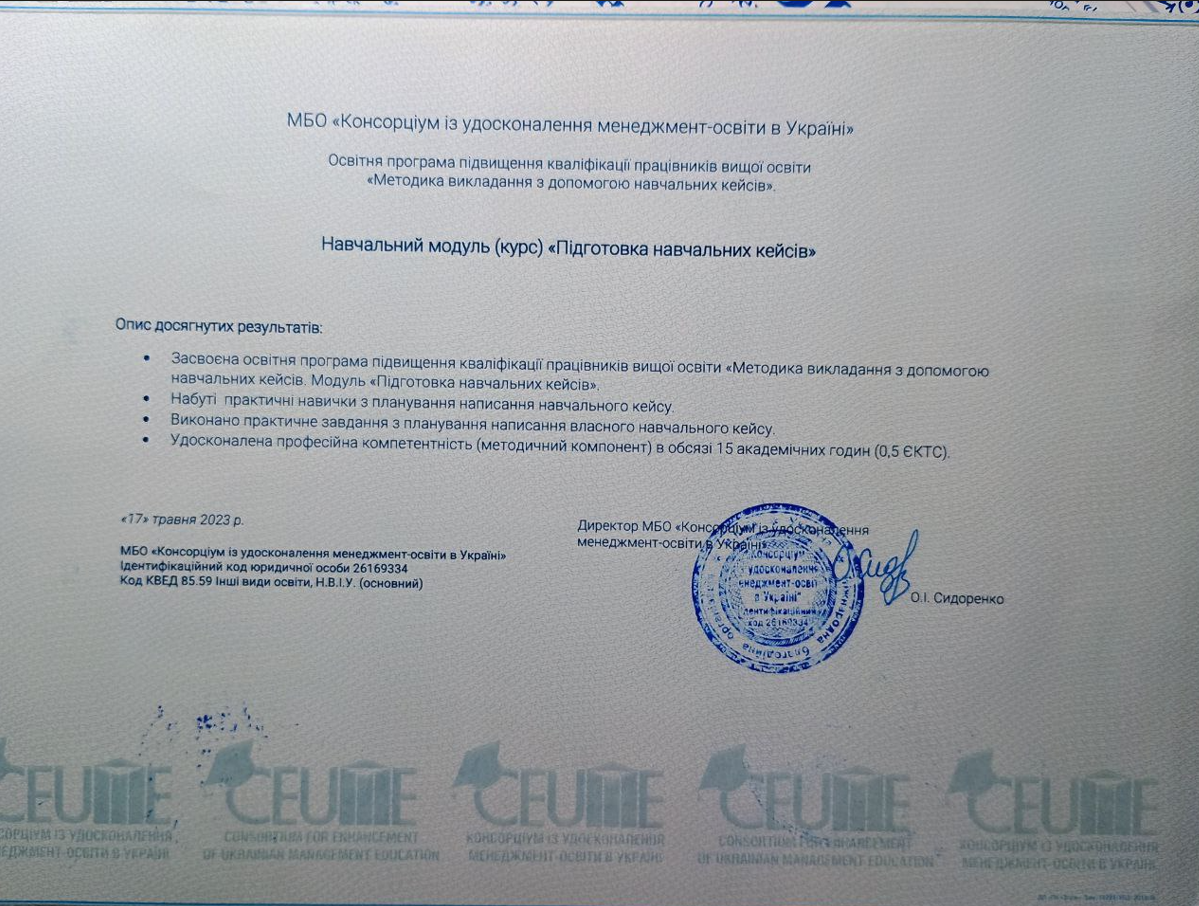 Сертифікат 14-15 листопада 2023 р. «Маркетингові та організаційні механізми повоєнного розвитку галузі гостинності та туризму України»).