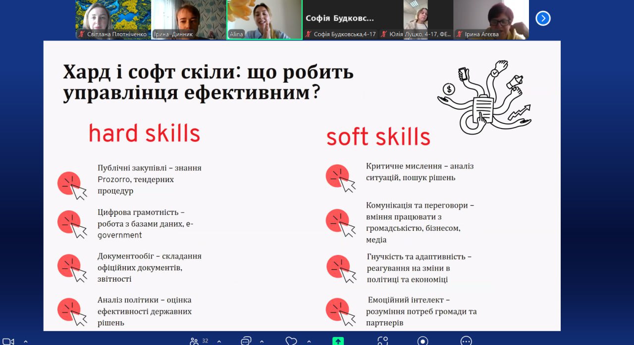 На початку лекції була надана інформація як вибрати професію, яку людина вибирає на все життя. Розглянута термінологія hard skills і soft skills – дві групи ключових знань і вмінь, які важливі для того, щоб вчасно виділити свої професійні навички і вміло розмістити інформацію про них в своєму резюме. Протягом лекції Аліна Олегівна надала інформацію як і де знайти роботу, а також надала приклад написання резюме.