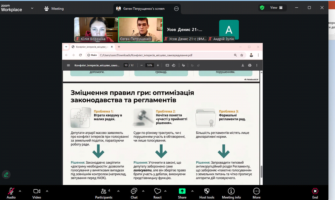 Під час презентацій здобувачі продемонстрували ґрунтовні аналітичні дослідження, уміння працювати з нормативно-правовою базою та сучасними інструментами управління у сфері державної політики. Значна увага була приділена проблемам розвитку територіальних громад, впровадженню електронного врядування, оцінюванню ефективності органів місцевого самоврядування та формуванню стратегічних підходів у публічному менеджменті.