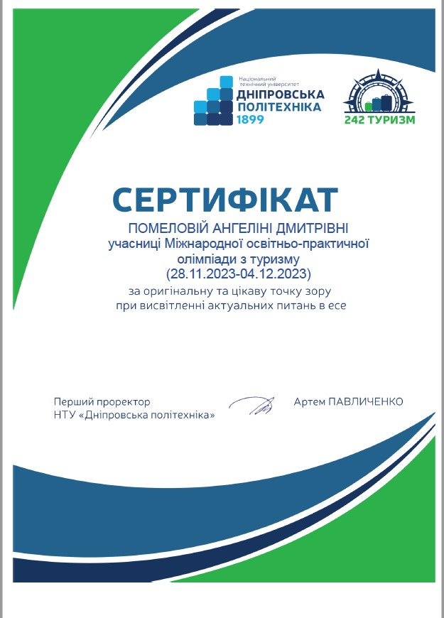 Здобувачка вищої освіти спеціальності Туризм 1сТР групи Помелова Ангеліна прийняла участь та здобула сертифікат з відзнакою в номінації «За оригінальну точку зору при висвітленні актуальних питань в есе» у Міжнародній освітньо-практичній олімпіаді з Туризму в Національному технічному університеті «Дніпровська політехніка»