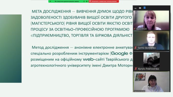 Метою зустрічі стало обговорення результатів анкетування здобувачів вищої освіти з даної спеціальності за освітньо-професійною програмою «Підприємництво, торгівля та біржова діяльність» щодо визначення якості освітньо-професійної програми, освітнього процесу, якості викладання дисципліни; академічної доброчесності при навчанні за даною освітньо-професійною програмою.