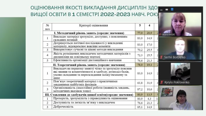 Учасники зустрічі були ознайомлені із результатами оцінки якості освітньо-професійної програми та навчального процесу, а також якості викладання дисциплін і дотримання академічної доброчесності.