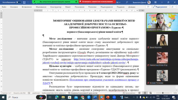 Метою зустрічі стало обговорення результатів анкетування здобувачів вищої освіти з даної спеціальності за освітньо-професійною програмою «Туризм» щодо визначення: