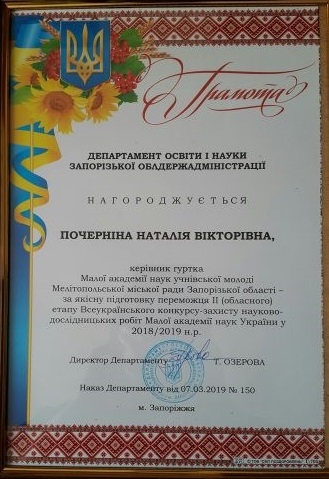 керівництво МАН - 1 місце в ІІ обласному турі конкурсу наукових робіт учнів – членів МАН по секції «Економічна теорія та історія економічної думки», м. Запоріжжя