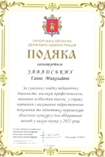 Подяка. Запорізька обласна державна адміністрація. 2022 р.