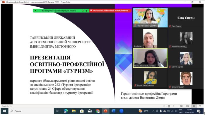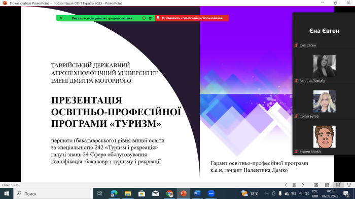 Гарант Валентина ДЕМКО зазначила, що з 2023 року освітньо-професійна програма змінює назву на «Туризм і рекреація» у зв’язку з Постановою КМУ № 1392 «Про внесення змін до переліку галузей знань і спеціальностей, за якими здійснюється підготовка здобувачів вищої освіти» від 16 грудня 2022 р. та з внесенням змін до Положення про освітні програми в ТДАТУ 2023 р.