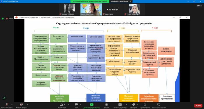 Здобувачам вищої освіти було представлено структурно-логічні схеми взаємозв’язку обов’язкових освітніх компонент, що забезпечують формування загальних та спеціальних (фахових) компетентностей випускника відповідно до Стандарту вищої освіти за спеціальністю 242 «Туризм і рекреація» галузі знань 24 «Сфера обслуговування», та надано їх анотований зміст, а також обґрунтовано відповідність освітніх компонентів програмним результатам навчання та фаховим компетенціям майбутніх бакалаврів з туризму та рекреації.
