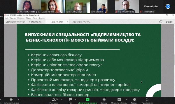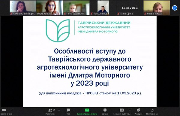 24 березня 2023 року відбулась профорієнтаційна зустріч представників кафедри економіки і бізнесу з випускниками Новокаховського та Бердянського коледжів ТДАТУ. Зустріч було організовано в онлайн-форматі на платформі Zoom. Із вступним вітанням виступила в.о. декана факультету економіки і бізнесу д.е.н., професор Ірина Колокольчикова. Гаранти освітніх програм «Підприємництво та торгівля», «Економіка» та «Туризм» в своїх виступах зробили акцент на особливостях та перевагах навчання в ТДАТУ. З інформацією щодо особливостей вступної кампанії-2023 та правил прийому в ТДАТУ виступив відповідальний секретар приймальної комісії, к.е.н, доцент Сергій Косторной. У абітурієнтів була можливість отримати вичерпні відповіді на питання щодо вступу, організації освітнього процесу, дуального навчання тощо.