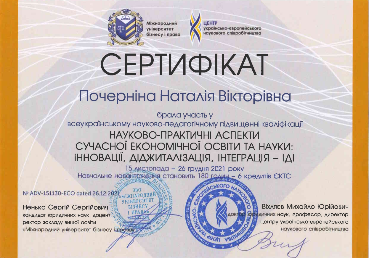 - Міжнародний університет бізнесу та права, Центр українсько-європейського наукового співробітництва. Сертифікат про підвищення кваліфікації №ADV-151130-ECO від 26.12.2021 р. Тема: «Науково-практичні аспекти сучасної економічної освіти та науки: інновації, діджиталізація, інтеграція – ІДІ», обсягом 180 годин (6 кредитів ЄКТС)