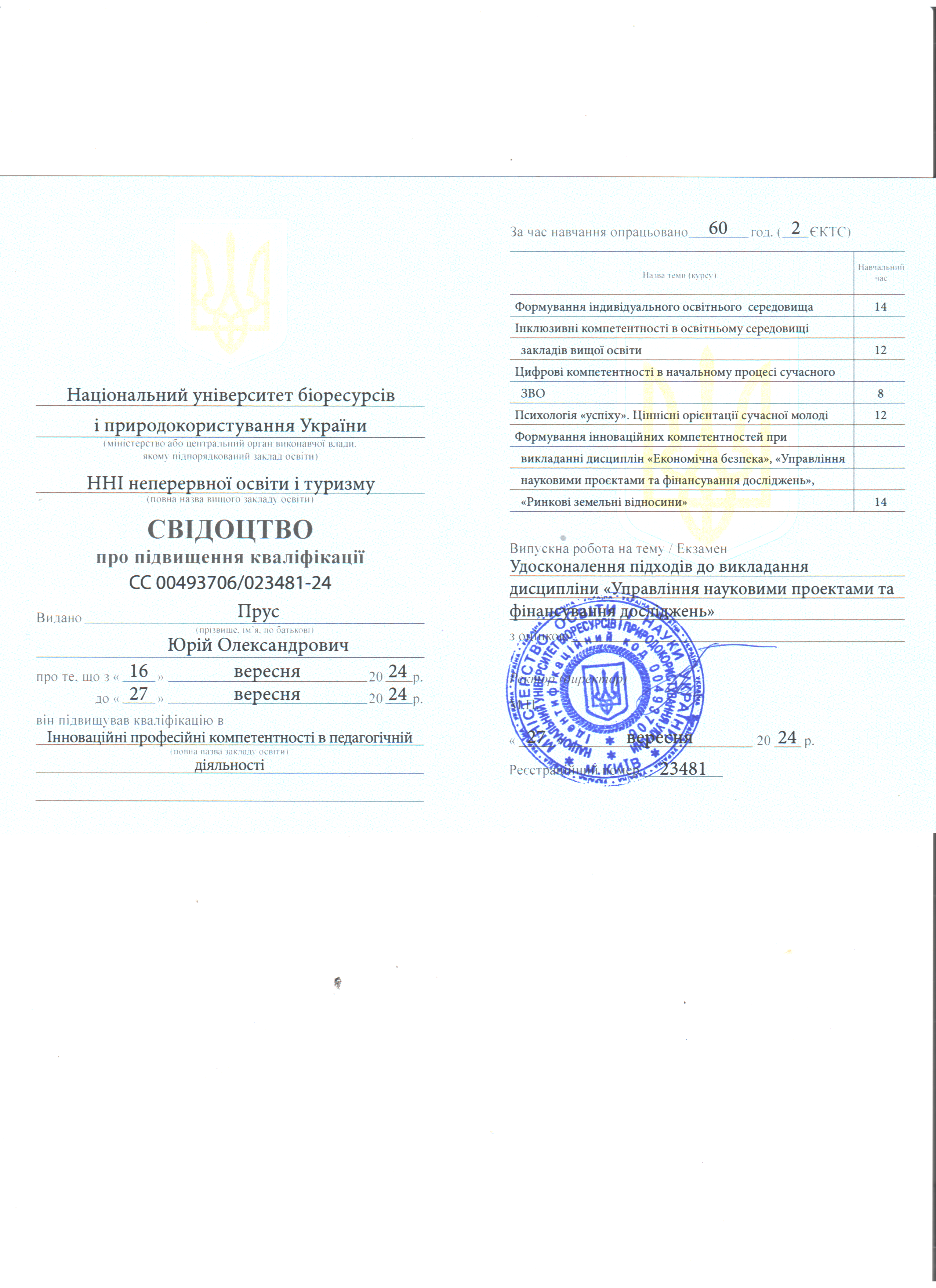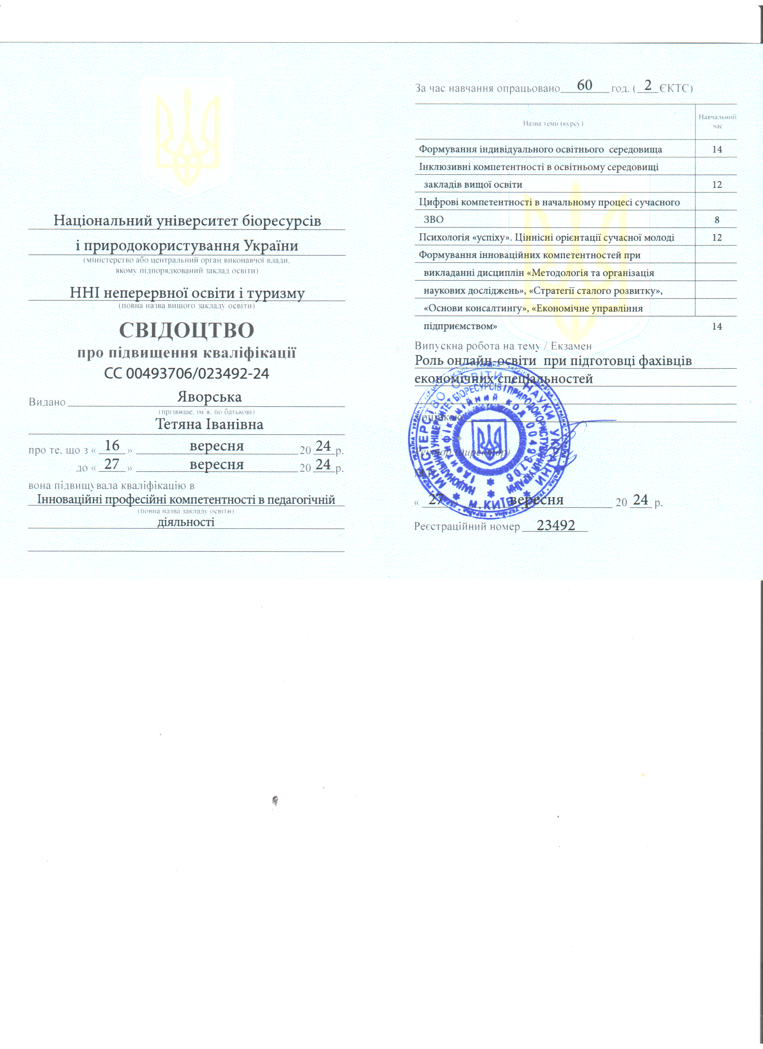 Національний університет біоресурсів і природокористування України, ННІ Неперервної освіти і туризму (м. Київ, Україна). Сертифікат про підвищення кваліфікації № СС00493706/005632-24 від 08.03.2024 р. Тема: “Інноваційні професійні компетентності у педагогічній діяльності”, обсягом 30 годин (1 кредит ЄКТС).
