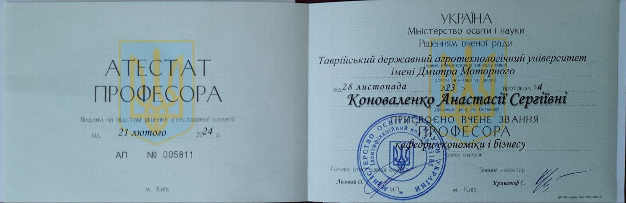 - Вчене звання. Міністерство освіти і науки України (м.Київ, Україна). Атестат доцента АД № 014595 від 21.02.2024 р. Вчене звання: «Доцент кафедри економіки і бізнесу», обсягом 3 кредити ЄКТС. Визнано підвищенням кваліфікації (наказ ректора ТДАТУ №104-ІПК від 31.05.2024 р.)