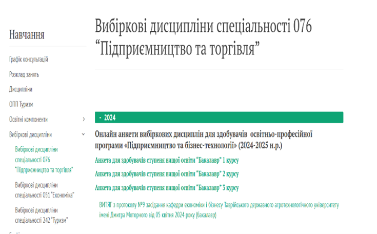 Вибіркові дисципліни для здобувачів спеціальності 076 «Підприємництво та торгівля»