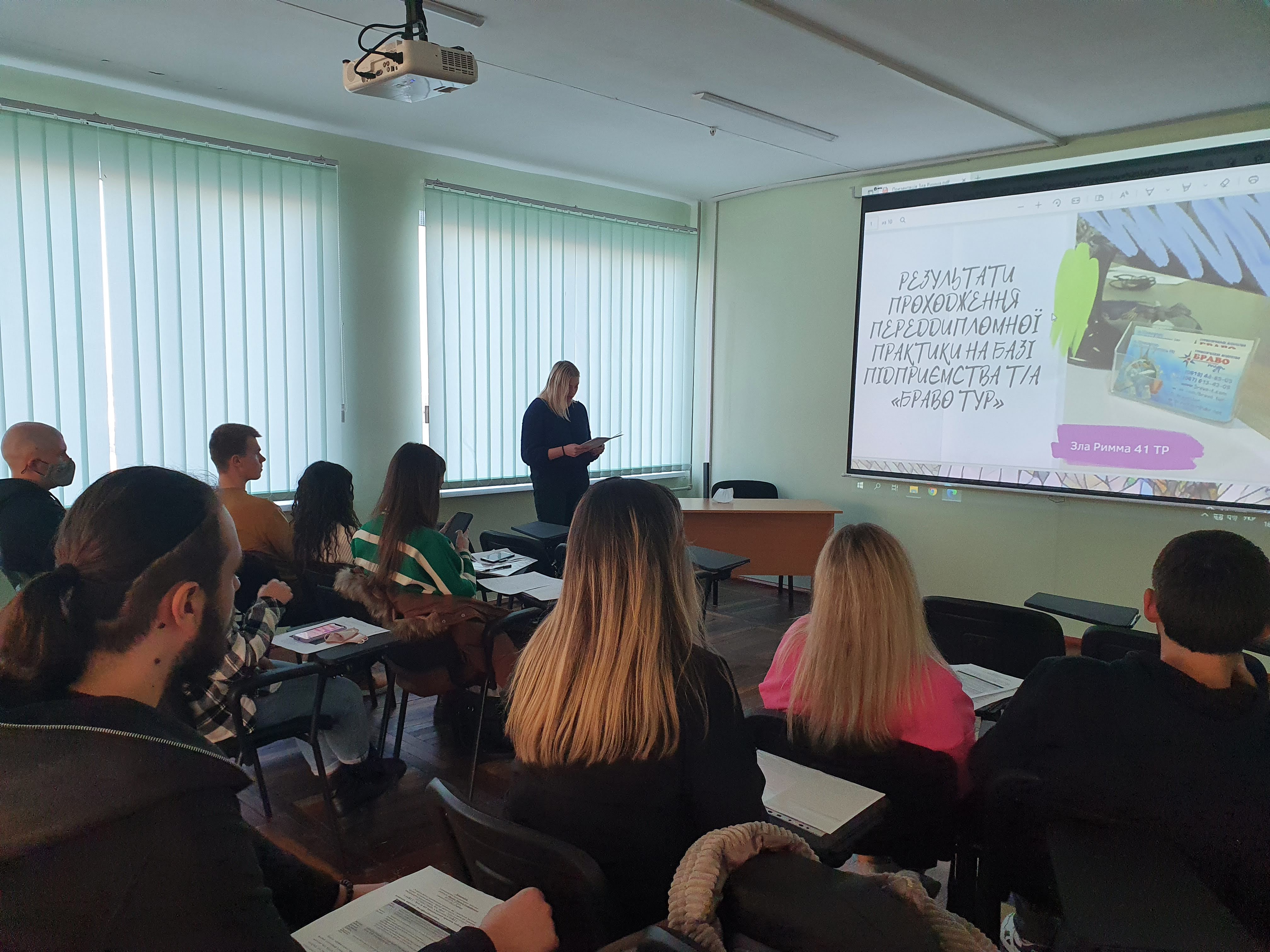 Підведення підсумків виробничої (переддипломної) практики на кафедрі БКМТ завершилась проведенням публічного захисту звітів з практик Доповідачами були здобувачі вищої освіти 4 курсу спеціальності 242 «Туризм». Також були присутні завідуючий практиками Юрій ЯКУНІЧЕВ, керівник переддипломної практики викладач Валентина Демко та інші члени кафедри.