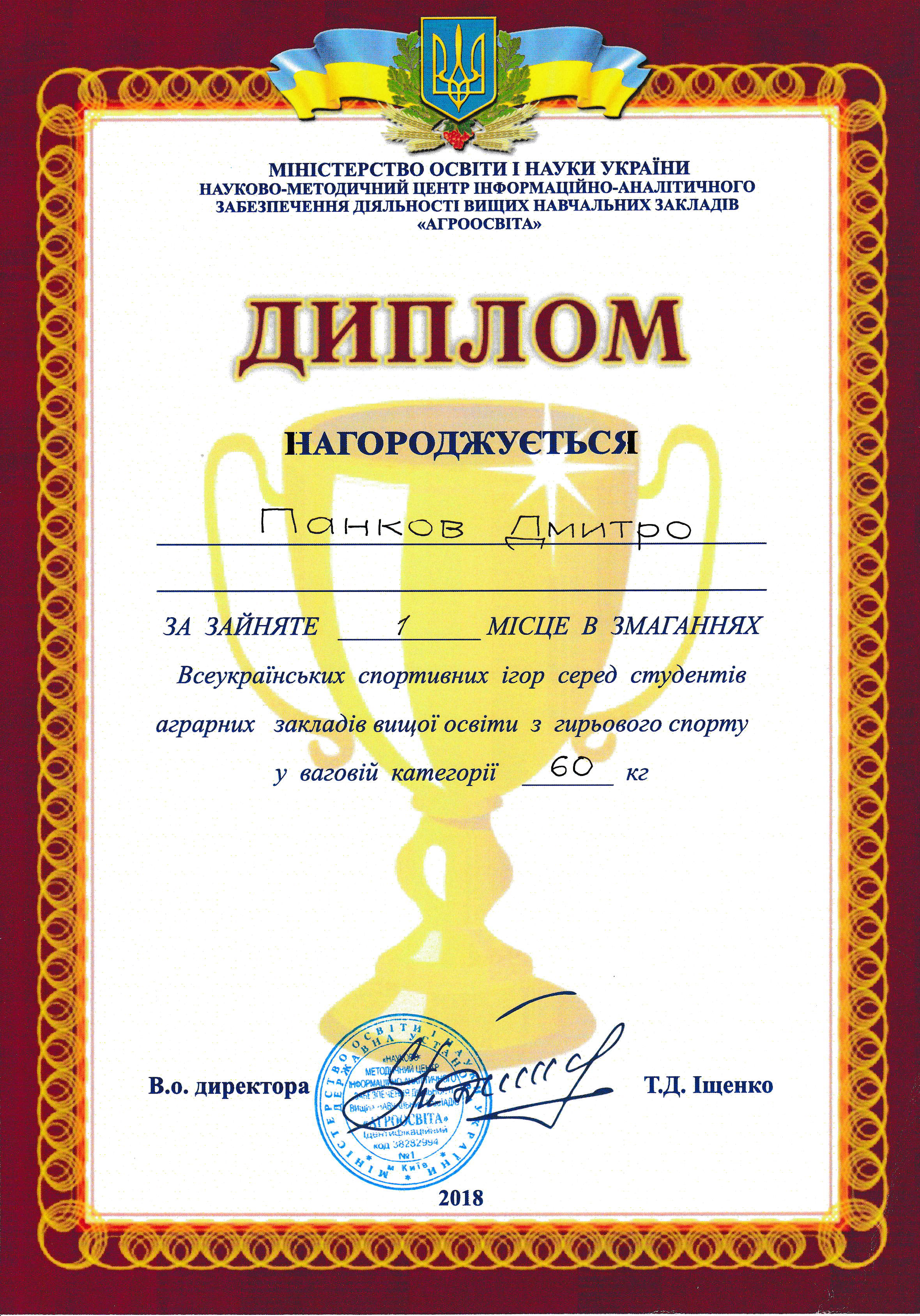 Щиро вітаємо Панкова Дмитра, студента 12 ЕЕ групи Енергетичного факультету з зайнятим першим місцем та золотою медаллю на Всеукраїнських спортивних іграх серед студентів аграрних закладів вищої освіти з гирьового спорту у ваговій категорії 60 кг. Бажаємо Дмитру нових спортивних досягнень та гарних виступів на змаганнях.