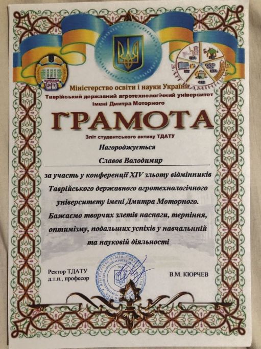 6-8 вересня 2019 року на базі спортивно-оздоровчого комплексу «Салют» ТДАТУ в с.м.т. Кирилівка проходив 14 зліт відмінників і студентського активу. Захід був дуже пізнавальним, захоплюючим і цікавим для студентів і викладачів. Студенти підшефних груп кафедри ЕТЕМ брали активну участь в різних культурно-масових, розважальних і спортивних заходах. В перший день пройшло відкриття зльоту відмінників 2019 року. Після відкриття була проведена студентська конференція, де студент 13МБЕЕ групи Славов Володимир (куратор Ковальов О.В.) презентував доповідь про розвиток альтернативної енергетики. За кращу доповідь він отримав грамоту і грошову премію.