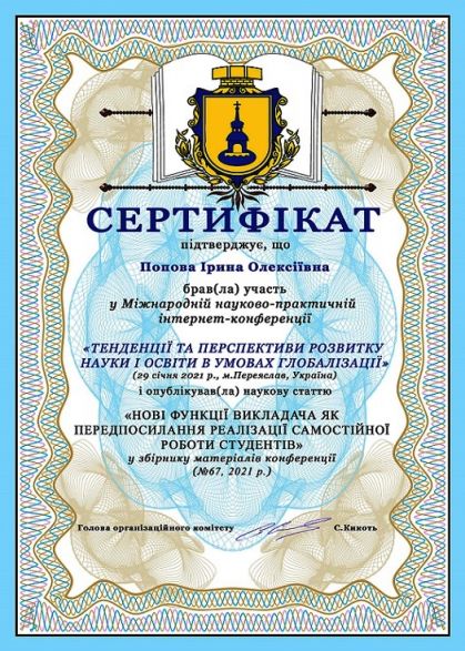 За результатами конференції опублікована стаття у збірнику наукових праць університету імені Григорія Сковороди м. Переяслав і отримано сертифікат.