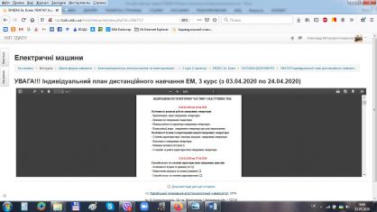 Під дистанційним навчанням розуміється індивідуалізований процес передання і засвоєння знань, умінь, навичок і способів пізнавальної діяльності людини, який відбувається за опосередкованої взаємодії віддалених один від одного учасників навчання у спеціалізованому середовищі, яке створене на основі сучасних психолого-педагогічних та інформаційно-комунікаційних технологій. Для дистанційного вивчення дисципліни «Електричні машини» в умовах карантину використано Навчально-інформаційний портал Таврійського державного агротехнологічного університету імені Дмитра Моторного.