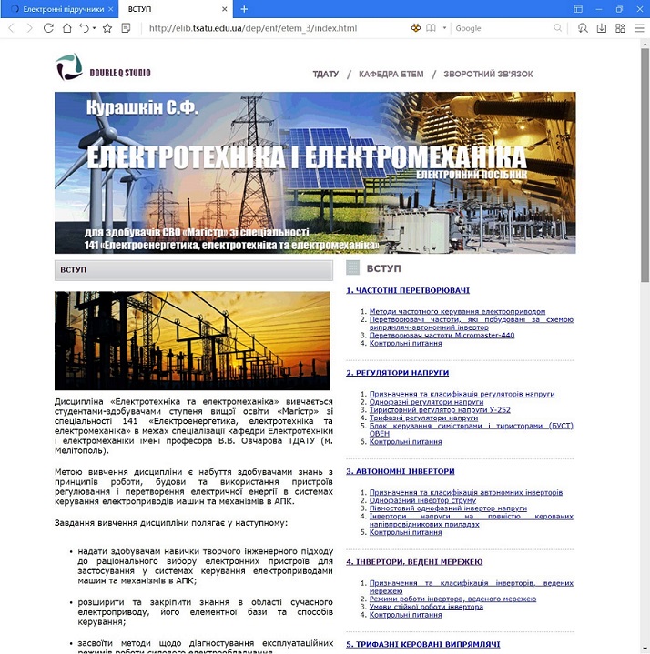 Каталог електронних видань Таврійського державного агротехнологічного університету імені Дмитра Моторного і Методичні розробки кафедри електротехніки і електромеханіки імені професора В.В.Овчарова поповнилися новим електронним посібником з навчальної дисципліни «Електротехніка та електромеханіка» за авторством доцента Сергія Курашкіна, що продовжує започатковану традицію щорічного випуску навчальних посібників з різних дисциплін, які вивчаються на кафедрі.