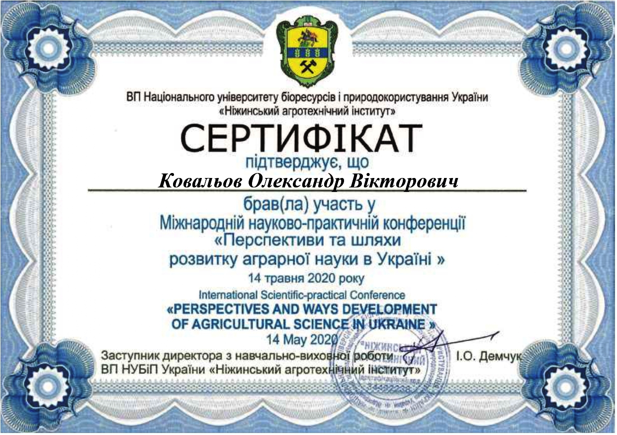 14 травня 2020 року старший викладач кафедри “Електротехніка і електромеханіка імені професора В.В. Овчарова” Ковальов В.О. взяв участь в Міжнародній науково-практичній конференції «Перспективи та шляхи розвитку аграрної науки в Україні» на базі ВП НУБіП України «Ніжинський агротехнічний інститут» (сертифікат).