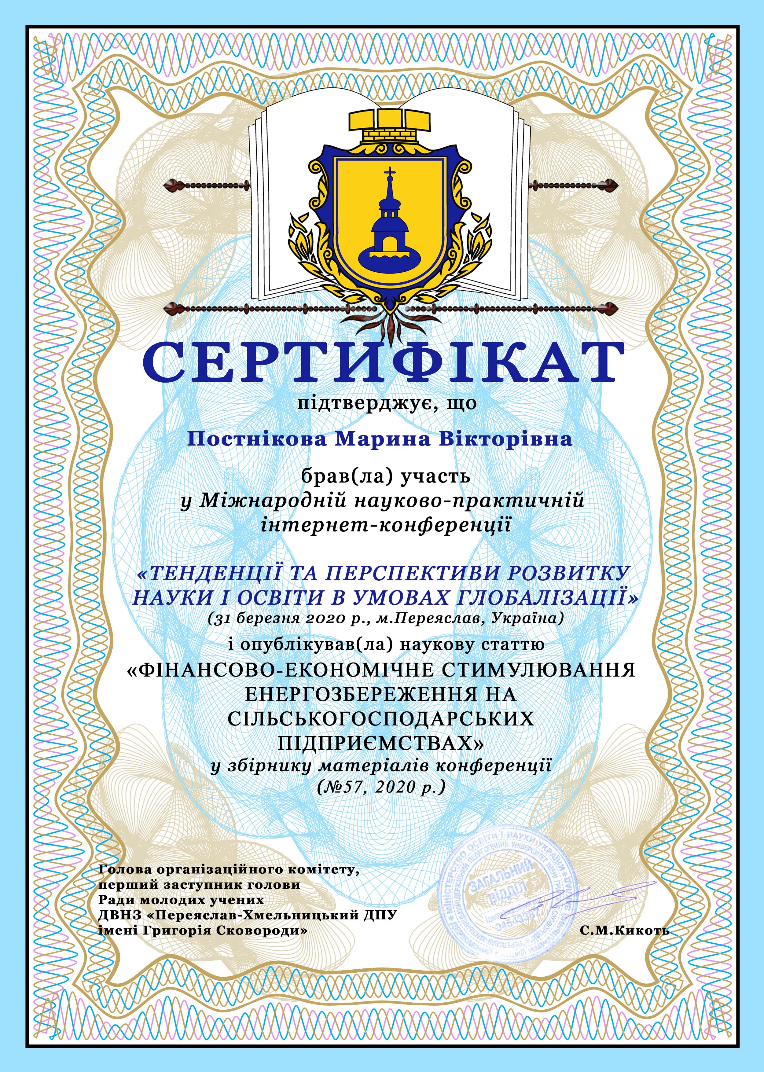 31 березня 2020 року к.т.н., доцент кафедри “Електротехніка і електромеханіка імені професора В.В. Овчарова” Постнікова М.В. взяла участь у Міжнародній науково-практичній інтернет-конференції “ТЕНДЕНЦІЇ ТА ПЕРСПЕКТИВИ РОЗВИТКУ НАУКИ І ОСВІТИ В УМОВАХ ГЛОБАЛІЗАЦІЇ”, м. Переяслав