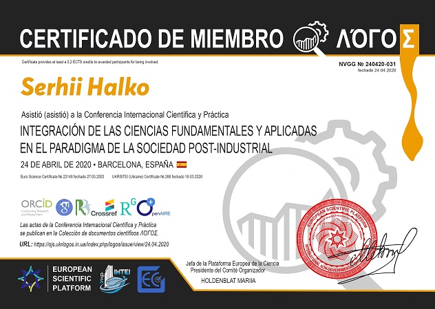 24 квітня 2020 року відбулась Міжнародна науково-практична конференція “Integración de las ciencias fundamentals y aplicadas en el paradigm de la sociedad post-industrial” (м. Барселона, Іспанія). Конференцію підтримав к.т.н., доцент кафедри Галько С.В. (сертифікат учасника)