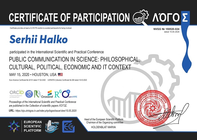 15 травня 2020 року к.т.н., доцент кафедри “Електротехніка і електромеханіка імені професора В.В. Овчарова” Галько С.В. (сертифікат) взяв участь в Міжнародній науково-практичній конференції “Public communication in science” (м. Х’юстон, США)