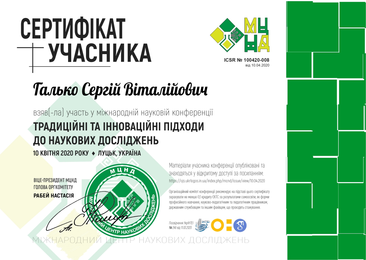 10 квітня 2020 року к.т.н., доцент Галько С.В. взяв участь у міжнародній науковій конференції “Традиційні та інноваційні підходи до наукових досліджень”, що проходила в місті Луцьк. За результатами роботи конференції видано збірник матеріалів конференції та отримано сертифікат учасника.
