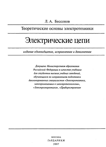 Бессонов Л. А. Теоретические основы электротехники. Электрические цепи : учебник / Л. А. Бессонов. – 11-е изд., перераб. и доп. – М.: Гардарики, 2007. – 701 с |