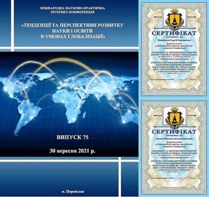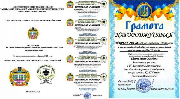 Крім того за межами ТДАТУ Сергій Щербаков, Максим Іванов і Павло Макенов прийняли участь з доповідями у Міжнародній науковій Інтернет-конференції «Тенденції та перспективи розвитку науки і освіти в умовах глобалізації» (30 вересня 2021 р.) і Всеукраїнській науково-практичній конференції (22 вересня 2021 р.), які відбулися в університеті Григорія Сковороди у м. Переяславі, отримали сертифікати учасників конференції. За результатами доповідей опубліковано дві статті у збірнику праць названого університету.