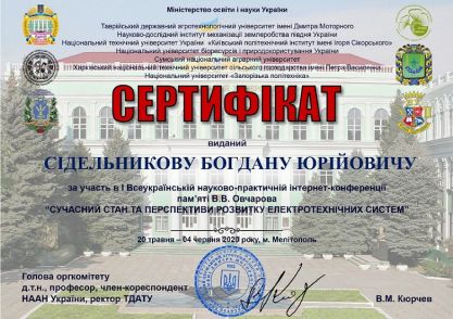 Гідним завершенням наукової роботи стала участь у I Всеукраїнській науково-практичній інтернет-конференції памяті В.В. Овчарова «Сучасний стан та перспективи розвитку електротехнічних систем», що проходила на базі кафедри електротехніки і електромеханіки імені професора В.В. Овчарова Таврійського державного агротехнологічного університету імені Дмитра Моторного, з 20 травня по 04 червня 2020 року, за результатами роботи якої опубліковано тези доповідей та отримані сертифікати про участь у конференції.