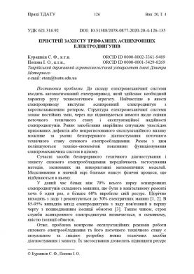 Тема статті актуальна, оскільки застосування багатодвигунного електроприводу у складі електромеханічної системи передбачає забезпечення його довготривалої надійної роботи не менший за гарантований виробником термін служби. Найбільш уразливим елементом конструкції є ізоляція обмотки статора.  Для забезпечення відповідної експлуатаційної надійності електродвигунів застосовуються пристрої діагностування та захисту. Проблема контролю експлуатаційних режимів роботи силового електрообладнання та його поточного технічного стану є актуальною та ініціює розробку нових технічних засобів діагностування і захисту. Розробку пристрою проведено із використанням новітньої елементної бази, що дозволяє значно спростити схемотехніку порівняно із застосуванням класичних рішень.