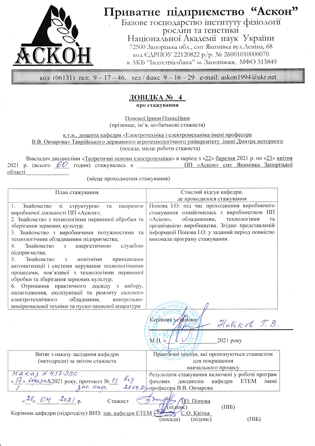 Стажування викладача кафедри ЕТЕМ на ПП «Аскон»