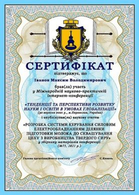 В конференції взяли участь здобувачі вищої освіти Максим Іванов і Сергій Щербаков. Гуртківці представили на конференцію доповідь на тему «Розробка системи керування силовим електрообладнанням ділянки підготовки молока до сквашування цеху з виробництва твердого сиру». Наукова робота стала логічним продовженням досліджень, проведених у студентському науковому гуртку, оскільки для побудови системи керування силовим електрообладнанням ділянки підготовки молока до сквашування в процесі виробництва твердого сиру необхідно розробити структуру і функційні зв’язки між робочими машинами технологічного процесу з виробництва сиру, асинхронними двигунами електроприводів і засобами контролю та керування системи керування електрообладнанням. Це потребує не тільки використання сучасних засобів керування електроприводами, а і удосконалення засобів контролю, діагностування режимів роботи і захисту асинхронних двигунів ділянок цеху з виробництва твердого сиру.