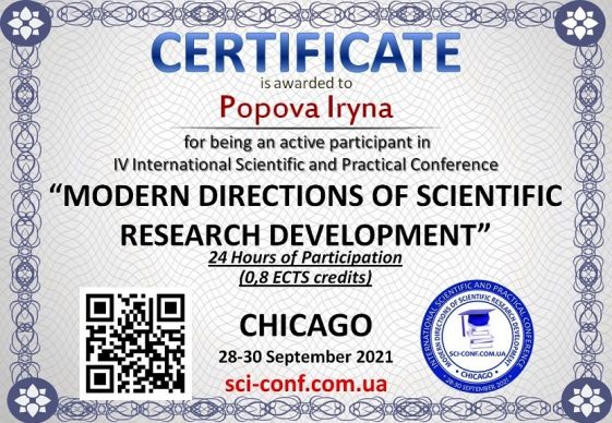 Стаття надрукована у збірнику матеріалів Міжнародної науково-практичної конференції «Modern directions of scientific research development» з присвоєнням міжнародного стандартного книжкового номера ISBN 978-1-73981-126-6.