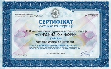 Викладачі кафедри електротехніки і електромеханіки імені професора В.В. Овчарова к.т.н., доцент С.Ф. Курашкін, к.т.н., доцент Постнікова М.В., ст. викладач Ковальов О.В. прийняли участь у XI Міжнародній науково-практичній інтернет конференції «Сучасний рух науки», яка відбувалася 8-9 жовтня 2020 року у м. Дніпрі, де виступили с доповіддю «The ambient temperature influence on induction motor time-current characteristics».