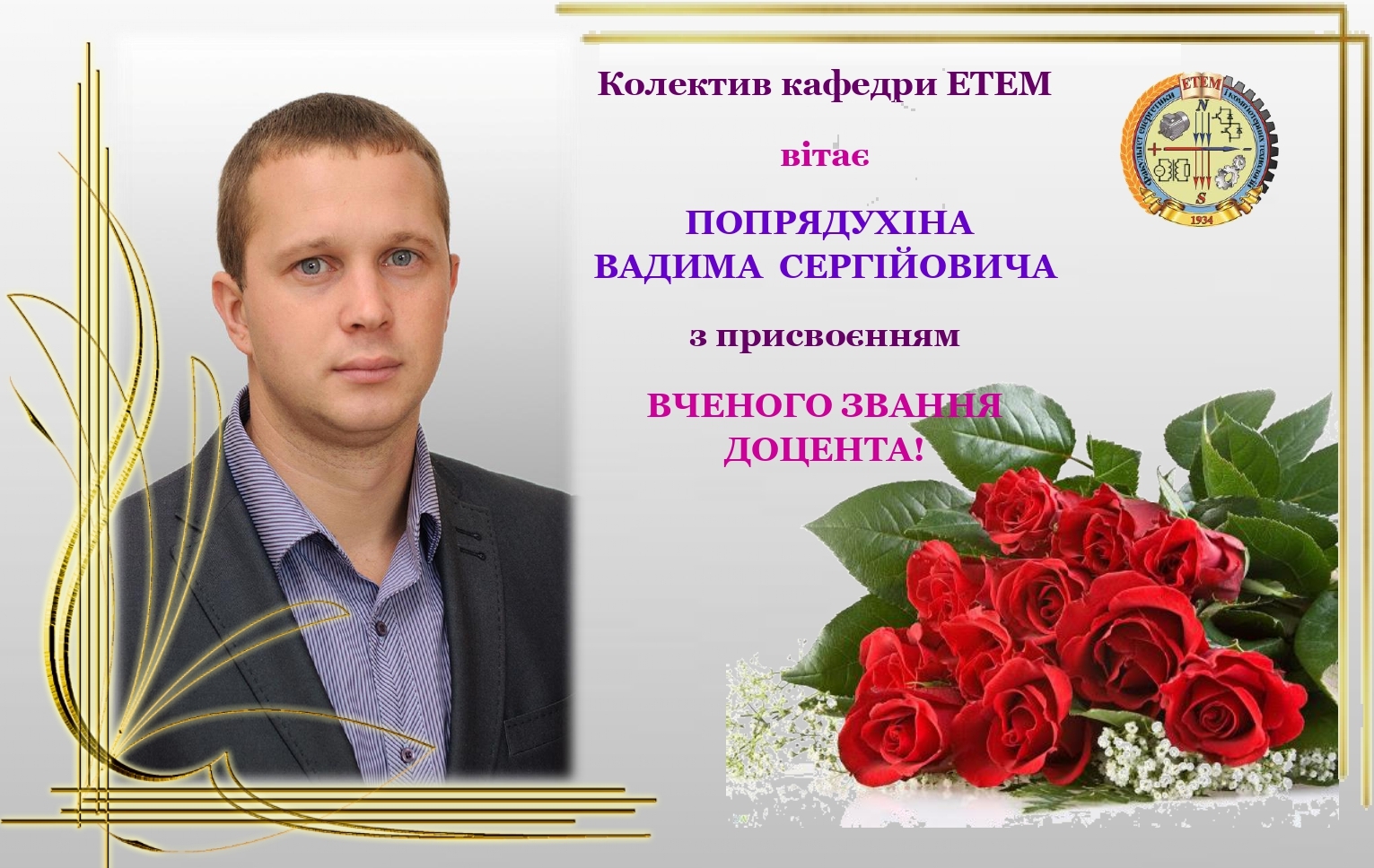 Рішення вченої ради про присвоєння Попрядухіну В.С. звання доцента кафедри електротехніки і електромеханіки затверджено наказом Міністерства освіти і науки України № 627 від 14.05.2020.