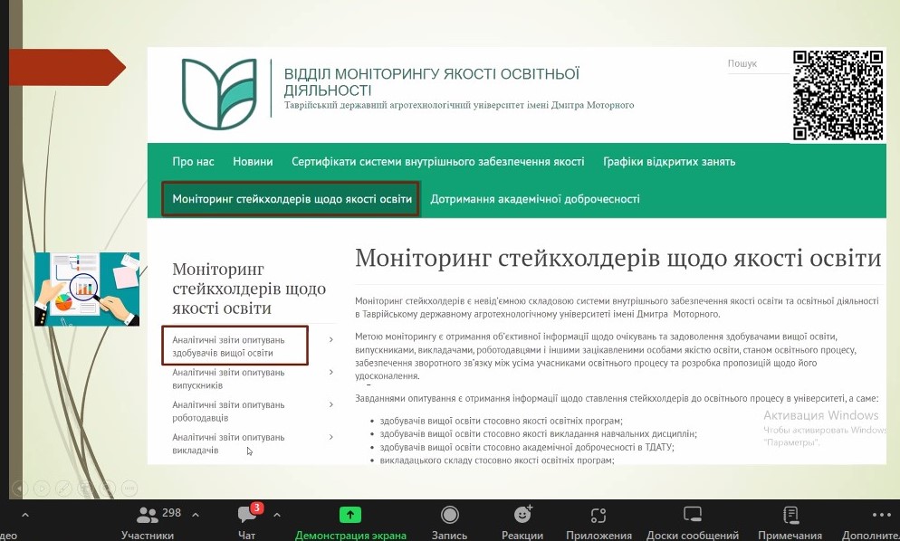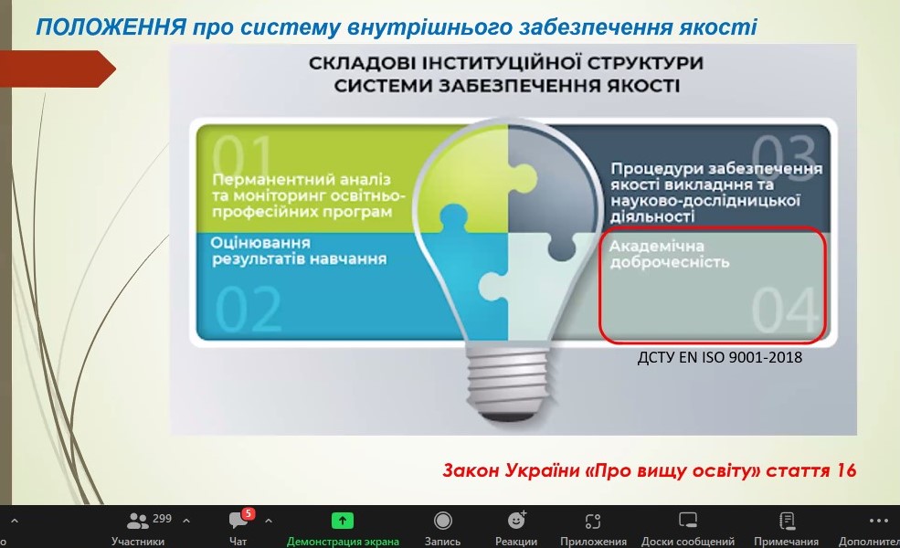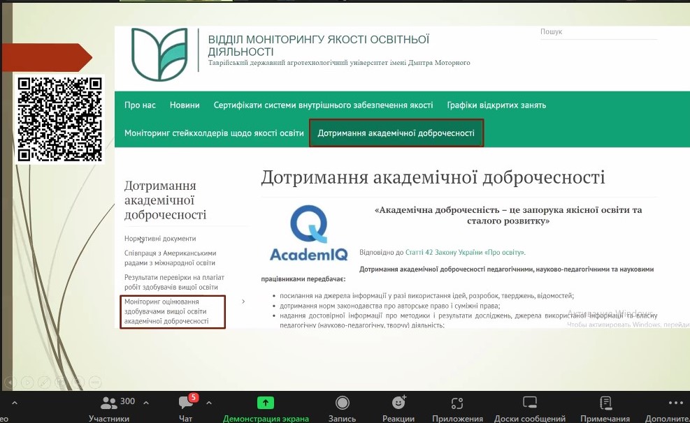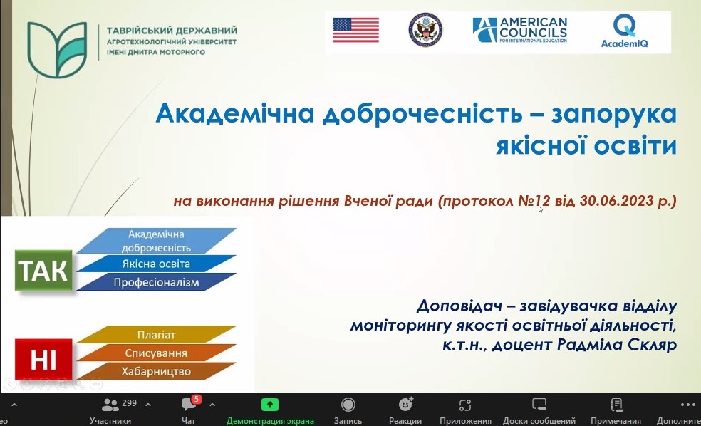 Також завідувачка відділу моніторингу повідомила результати опитування учасників освітнього процесу в Таврійському державному агротехнологічному університеті імені Дмитра Моторного. З пропозиціями покращення результатів академічної доброчесності виступив перший проректор Олександр Ломейко.