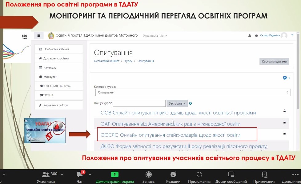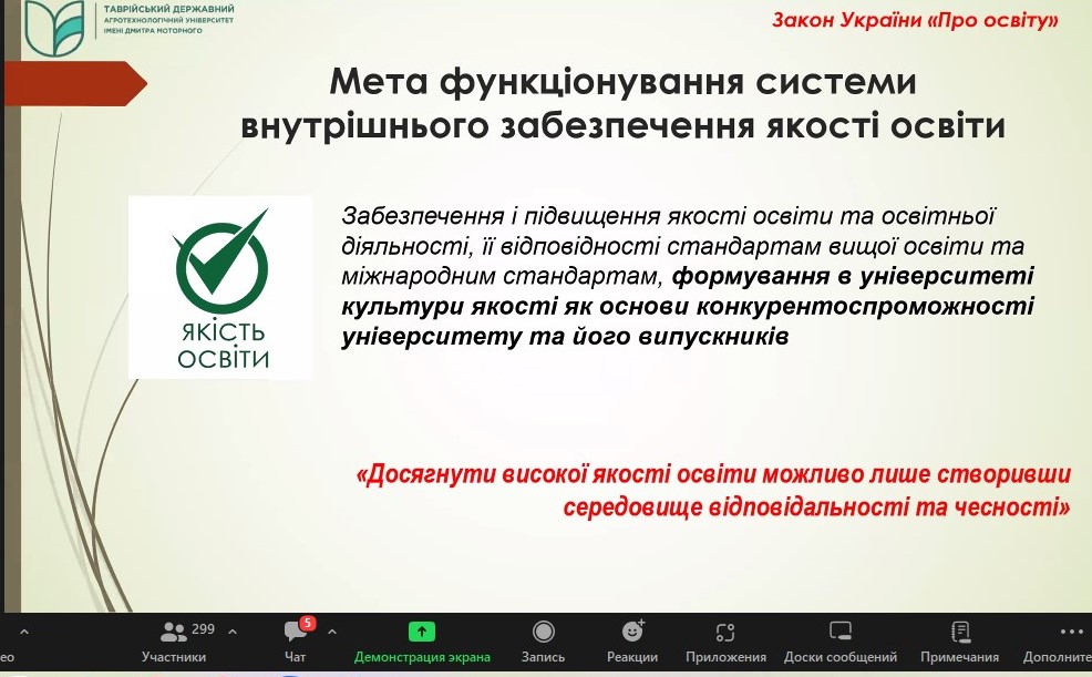 Під час зустрічі завідувачка відділу моніторингу к.т.н., доцент Радміла Скляр нагадала учасникам основні нормативні документи, що регламентують функційність системи внутрішнього забезпечення якості вищої освіти в університеті: Положення про систему внутрішнього забезпечення якості вищої освіти в ТДАТУ, Положення про освітні програми в ТДАТУ, Положення про опитування учасників освітнього процесу в ТДАТУ, Положення про академічну доброчесність учасників освітнього процесу в ТДАТУ, Положення про систему запобігання та виявлення академічного плагіату в ТДАТУ та інші.
