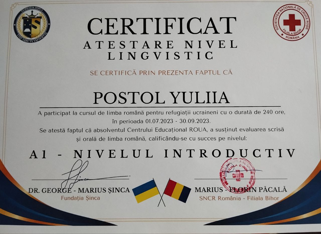 - Цей сертифікат засвідчує, що Юлія Постол успішно пройшла кваліфікацію на рівні А1 (Nivelul Introductiv) шляхом складання письмових та усних іспитів з румунської мови під час навчання на курсі румунської мови Освітнього центру для українських біженців ROUA, тривалістю 240 годин, у період з 01.07.2023 до 30.09.2023.