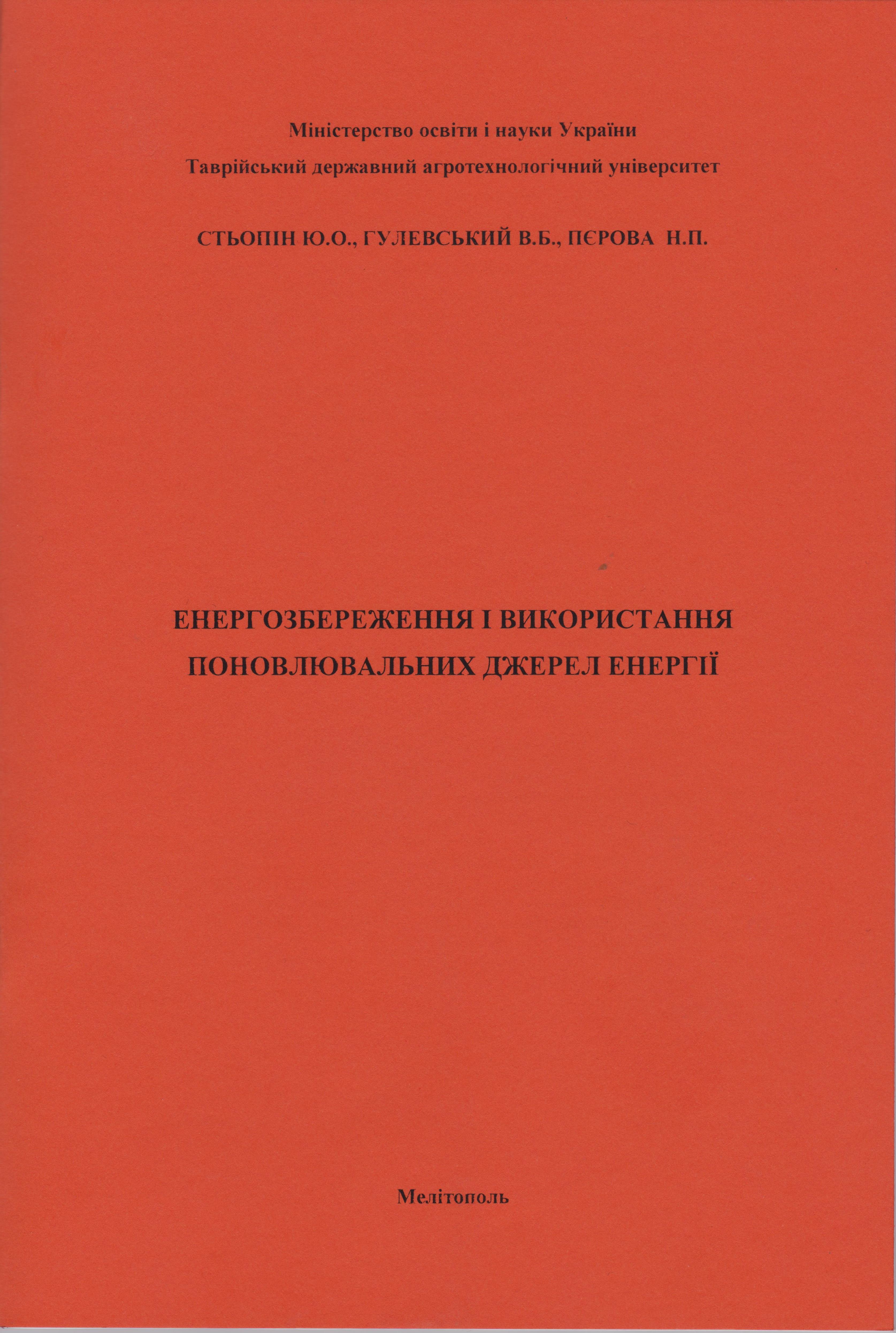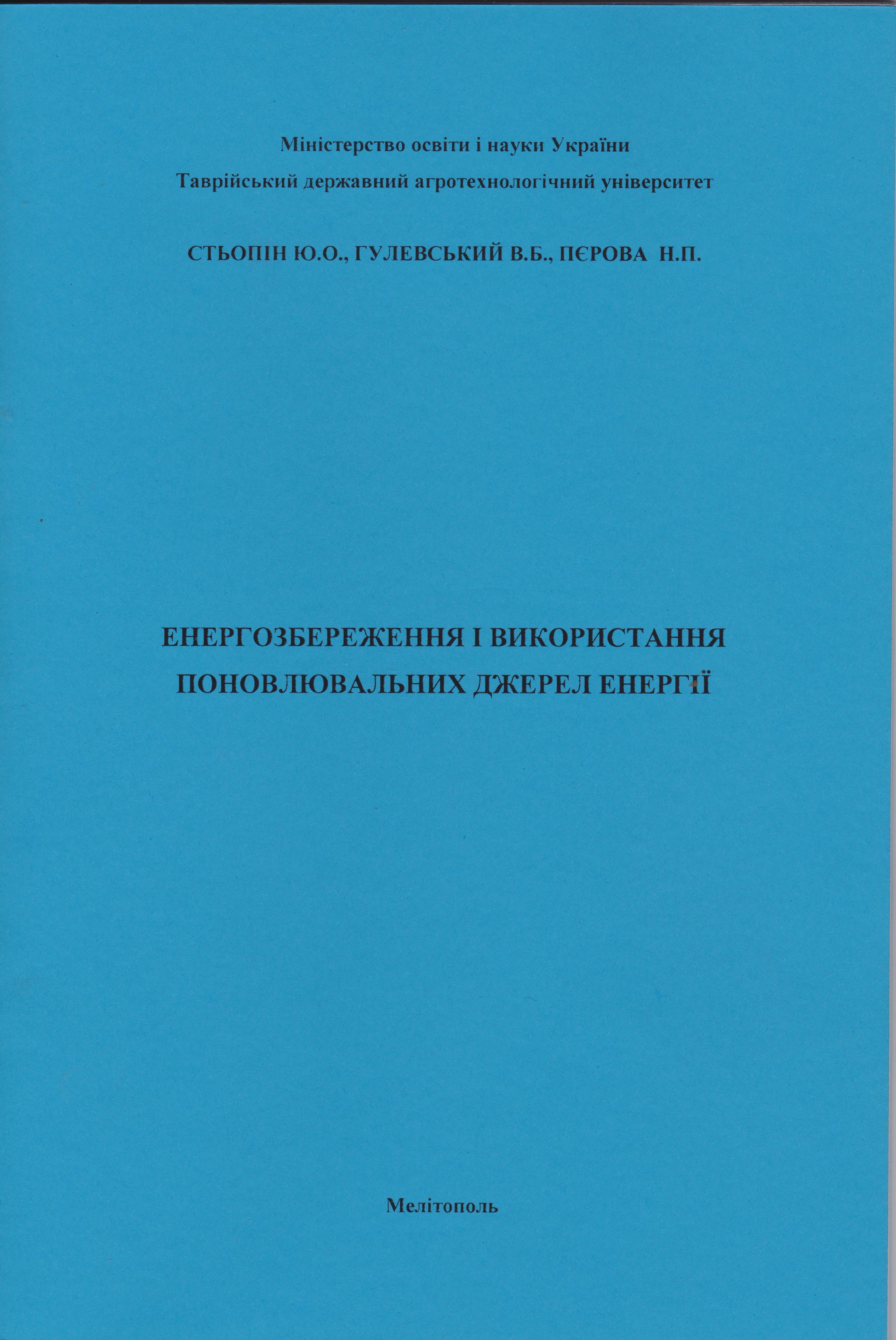 Енергозбереження і використання поновлювальних джерел енергії: Методичні вказівки до лабораторних робіт для здобувачів ступеня вищої освіти «Магістр» зі спеціальності 141 – “Електроенергетика, електротехніка та електромеханіка” / Ю. О. Стьопін, В. Б. Гулевський, Н. П. Перова – Мелітополь: ТДАТУ, 2019. – 40 с. ISBN 978-966-2470-02-4